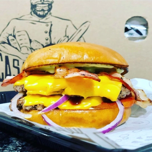 Pão de brioche, 2 hambúrgueres artesanal de 115gr, queijo cheddar, bacon, maionese da casa, barbecue, cebola roxa e to... Ver completo