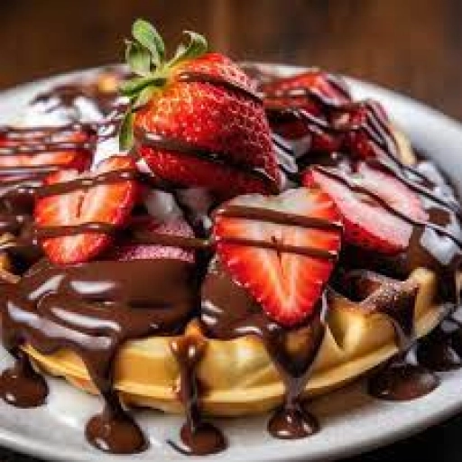 Waffle, brigadeiro, ganache de chocolate, morango ou banana, sorvete de creme e amendoim