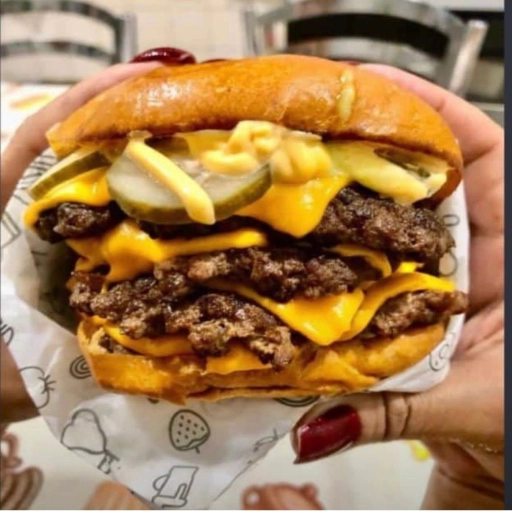 Pão de brioche, 3 hambúrgueres artesanal de 75gr, queijo cheddar e maionese da casa.