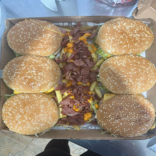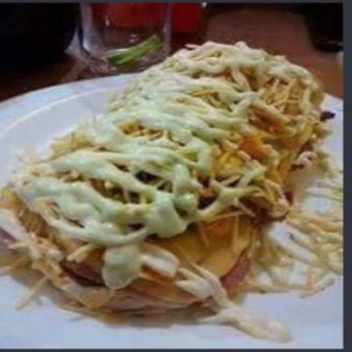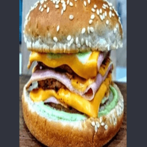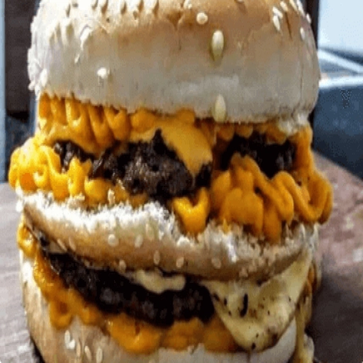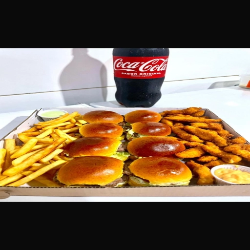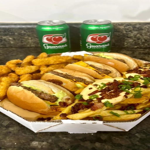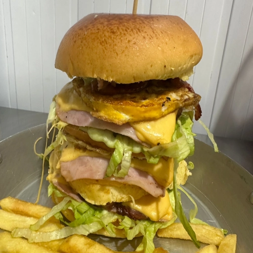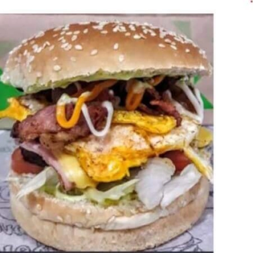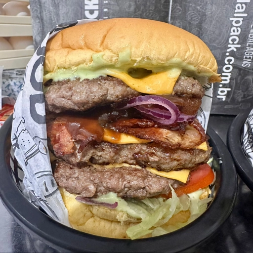 2 pães de hambúrguer abertos, 4 hambúrgueres, bacon, calabresa, ovo, frango, queijo, presunto, cheddar, catupiry, mai... Ver completo