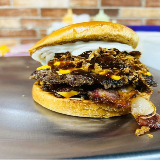 Pão de brioche selado, 2 smash de 85gr, queijo cheddar, bacon, maionese grill, barbecue e cebola crispy.
