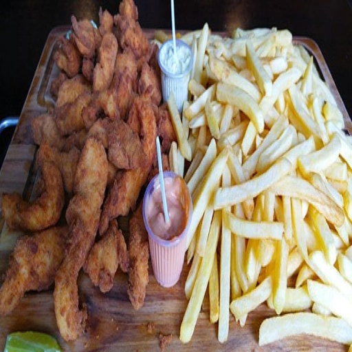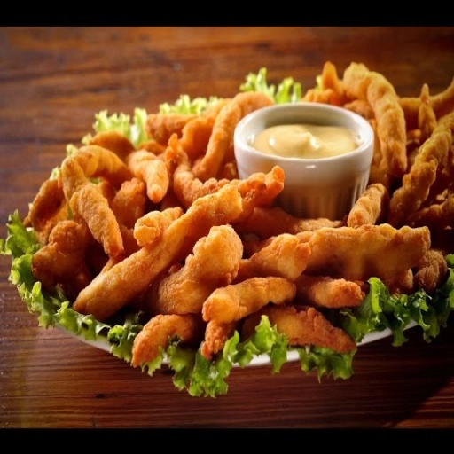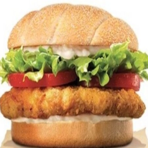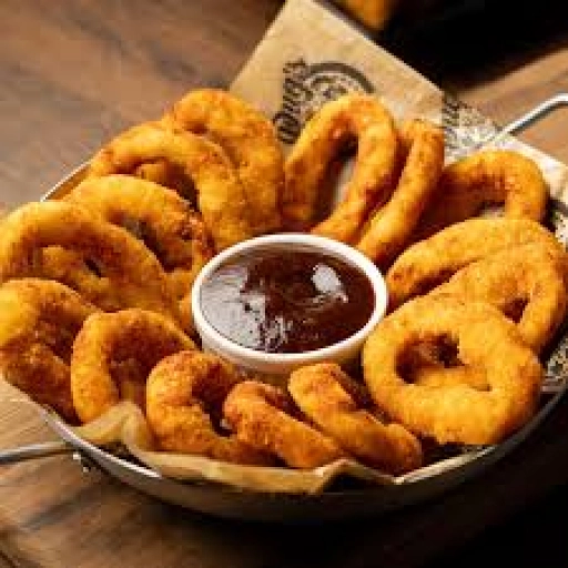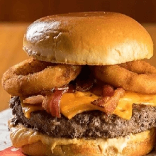 Pão, hambúrguer, queijo cheddar, onion rings, maionese da casa, alface e tomate.