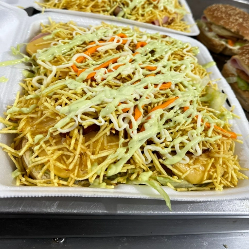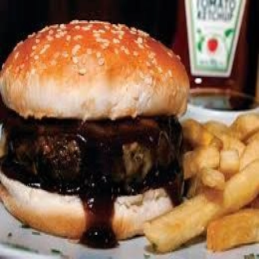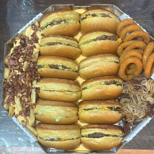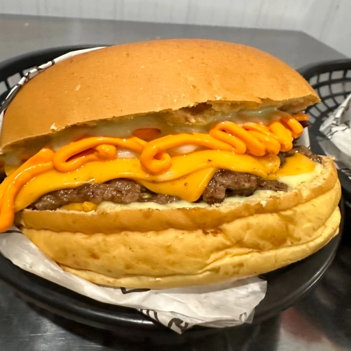 Pão, 2 hambúrgueres, queijo cheddar, maionese da casa, molho rose, cebola picada e alface.