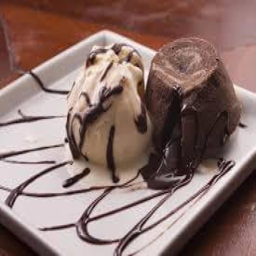 Bolinho de chocolate, 1 bola de sorvete de creme e calda de chocolate