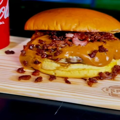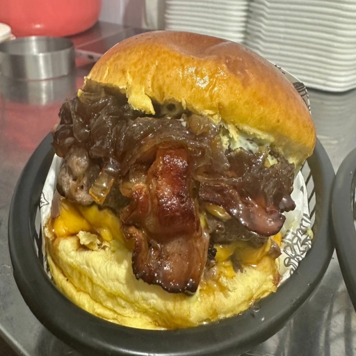 Pão de brioche, hambúrguer artesanal de 130gr, bacon, queijo cheddar, cheddar melt, maionese da casa e cebola na chapa... Ver completo