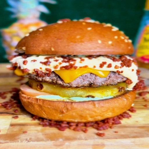 Pão de brioche, 1 hambúrguer artesanal de 115gr, queijo cheddar, farofa de bacon, maionese da casa, abacaxi flambado c... Ver completo