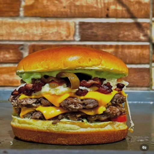 Pão de brioche, 3 hambúrgueres artesanal de 115gr, queijo cheddar, bacon, maionese da casa, barbecue, cebola roxa e to... Ver completo