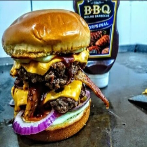 Pão de brioche, 2 hambúrgueres artesanal de 150gr, bacon, queijo cheddar, barbecue e cebola roxa.
